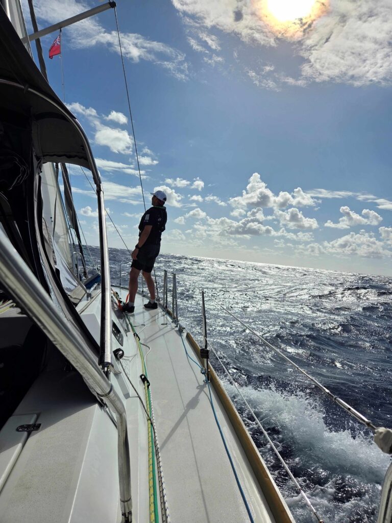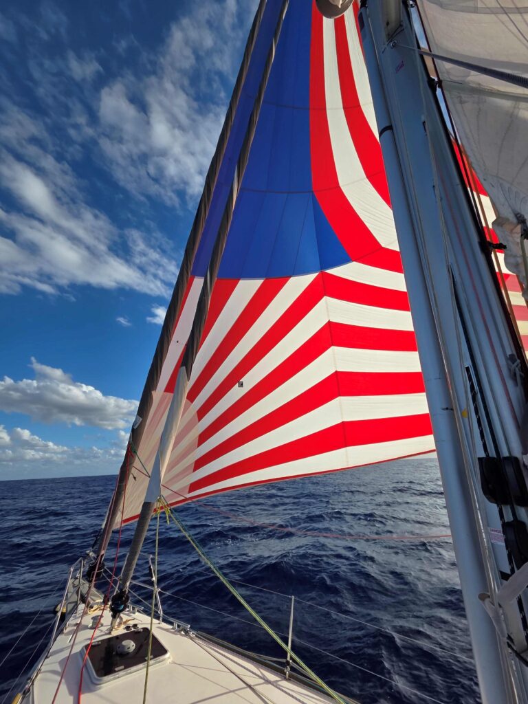 Dags för avfärd igen. Vi startade på morgonen den 5 nov. Väderutsikterna var goda med lite för lite vind bitvis. Vi fortsatte sydost för att komma tillräckligt ostvart när passadvindarna började. Från Hampton till Bermuda var det ca 600 nm, nu hade vi 1000 nm att avverka. Dagarna gick och det blev varmare oach varmare ju mer söderut vi kom. Vi fick bitvis gå för motor och nu kom även de första ”squallen”. Regnbyar med mycket vind och kraftigt regn. Man kunde se dem på långt håll men de var snabbt över. Vid ett tillfälle med lite vind testade vi vår gennaker för första gången. Pernilla är inte så förtjust i den för den är alldeles för amerikansk tycker hon. Hon vill att den skall vara gul och blå!