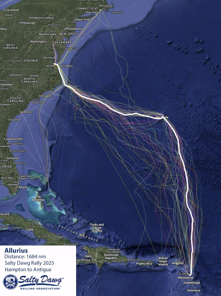 Väl framme i Hampton var det en massa aktiviteter organiserada av Salty Dawg som vi skrev om i förra bloggen. 1 november var planerad avresedag men vi hade nästan daglinga uppdateringar av vädret med Chris Parker som är meteorolog och har ett företag som ger råd till seglare ang vädret. Han är specialiserad på Carribean Sea och västra atlanten. Vädret var inte optimalt så starten blev uppskjuten till 4 november. Mest för att man skulle få en behaglig resa genom golfströmmen. Man vill inte a ha vinden mot strömmen för då kan vågorna bli brutalt stora. Planen var att gå söderut från Hampton till Cape Hatteras och där styra vinkelrätt mot golfströmmen. Där är golfströmmen som smalast, ca 40 nm, men samtidigt starkast. Så samtidigt som vi störde rakt sydost förflyttades vi med ca 4 knop sidleds och hamnade norrut när vi lämnade goldströmmen. Det tog ca 6 timmar att komma igenom och vågorna var inget att tala om. Den nordliga vinden hade lagt sig. Väl ute ur strömmen styrde vi nästa rakt söderut för att undgå ett kraftigt vindområde. Men till kvällen den 5 nov var det över oss. 30 knop stadigt och 40 knop i byarna. Dvs stadigt 15 m/s och 20 m/s i byarna. Vågorna byggde snabbt upp och blev mellan 5 och 7 m höga. Dessutom kolsvart efter kl 6 på kvällen. Lite läskigt var det så här i början på passagen.